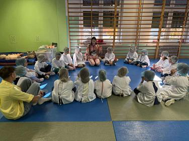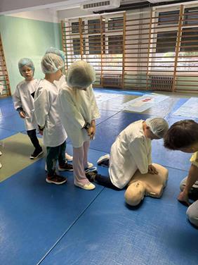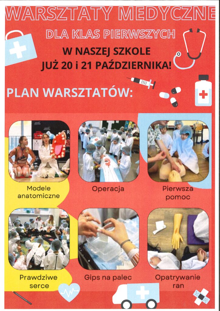 W dniach od 20 do 21 października uczniowie wszystkich pierwszych klas wzięli udział w warsztatach medycznych, które poprowadziła grupa edukacyjna Zdobywcy Talentów. W ramach tych zajęć dzieci wcieliły się w rolę lekarzy, a następnie uczyły się na modelach o całym ciele i poznały narządy wewnętrzne wraz z ich funkcjami. Ponadto poznały zasady udzielania pierwszej pomocy oraz je przećwiczyły. Dużym zainteresowaniem cieszyła się również sztuka opatrywania ran. Każdy z uczniów zakończył tę medyczną przygodę z gipsem na palcu oraz większą wiedzą na temat udzielania pierwszej pomocy czy dbania o własny organizm.
