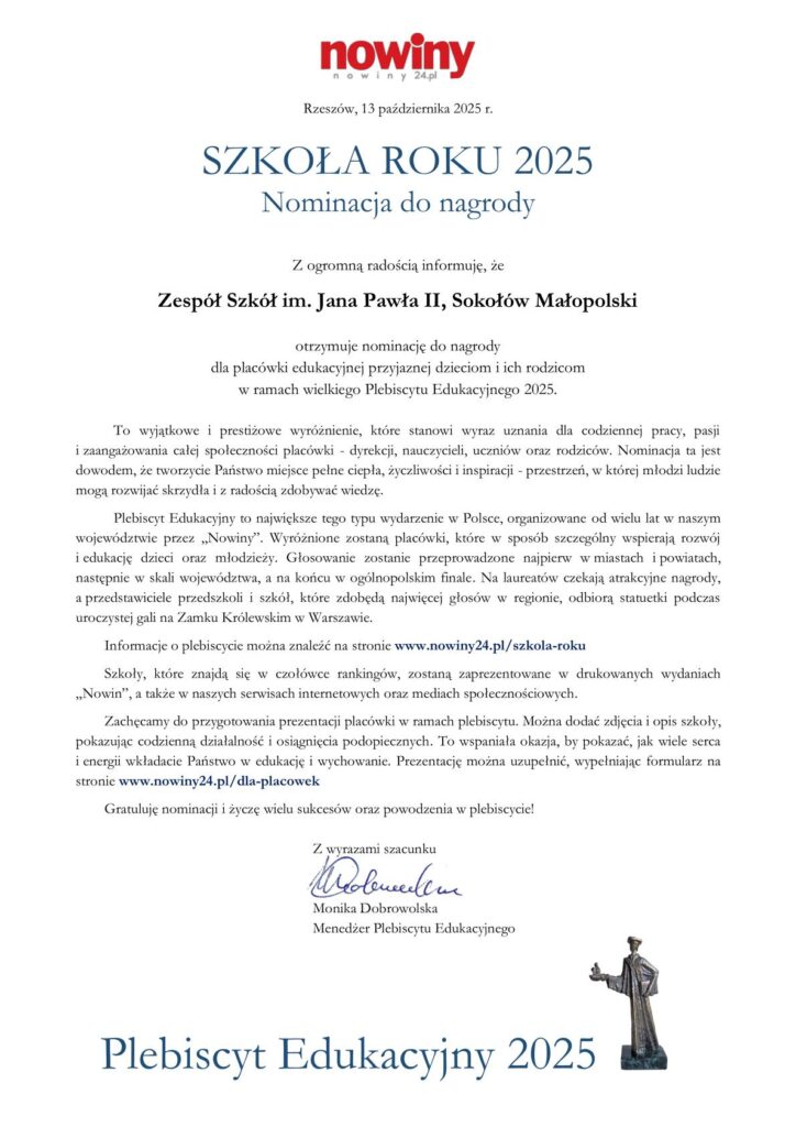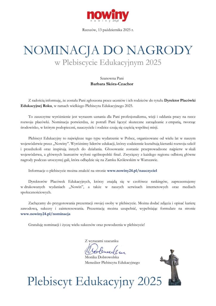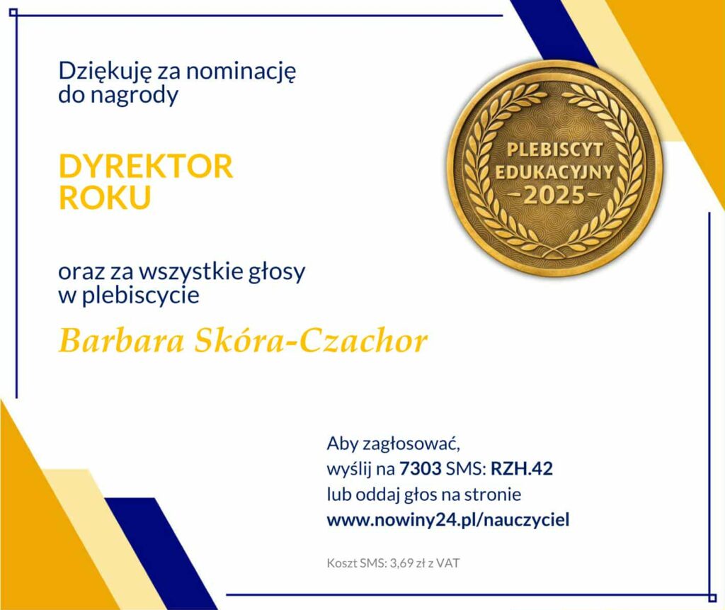 Jest nam niezmiernie miło poinformować, że nasza szkoła i pani Dyrektor Barbara Skóra – Czachor została zgłoszona do Plebiscytu Edukacyjnego 2025.