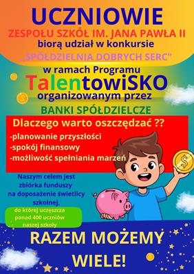 w konkursie „Spółdzielnia dobrych serc”, organizowanym w ramach Programu TalentowiSKO przez Bank Spółdzielczy. To wyjątkowa inicjatywa, której celem jest rozwijanie talentów, uczenie współpracy, przedsiębiorczości i wrażliwości społecznej. W ramach programu będziemy organizować różnorodne akcje, warsztaty oraz występy, podczas których każdy chętny uczeń będzie mógł pokazać swój talent i zaangażowanie. Zebrane fundusze z kiermaszy i wydarzeń organizowanych w ramach Programu TalentowiSKO zostaną przeznaczone na jeden wspólny cel – wyposażenie szkolnej świetlicy, z której korzysta ponad 400 uczniów, spędzających tam codziennie czas wolny. Serdecznie zapraszamy wszystkich uczniów do udziału i aktywności w tym pięknym przedsięwzięciu!