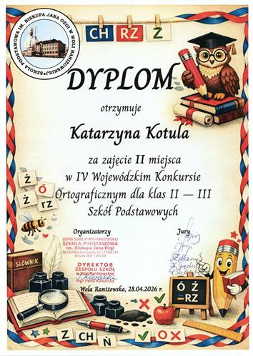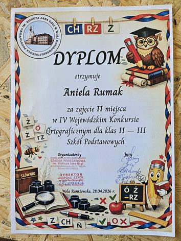 W dniu 28 kwietnia dwie uczennice klasy III b – Katarzyna Kotula i Aniela Rumak – pod opieką wychowawczyni, pani Joanny Wójcik, wzięły udział w IV Wojewódzkim Konkursie Ortograficznym w Woli Raniżowskiej. Z dumą informujemy, że dziewczęta wywalczyły wysokie II miejsce, wykazując się znakomitą znajomością zasad ortografii oraz świetną współpracą zespołową.