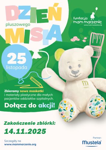 Zapraszamy do udziału w zbiórce z okazji Dnia Pluszowego Misia dla pacjentów dziecięcych oddziałów szpitalnych – podopiecznych fundacji „Mam Marzenie”. Do 13 listopada można przynosić do wychowawców poszczególnych klas nowe maskotki i materiały plastyczne. Zebrane dary zostaną przekazane potrzebującym 25 listopada.