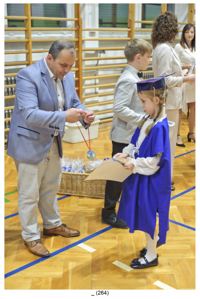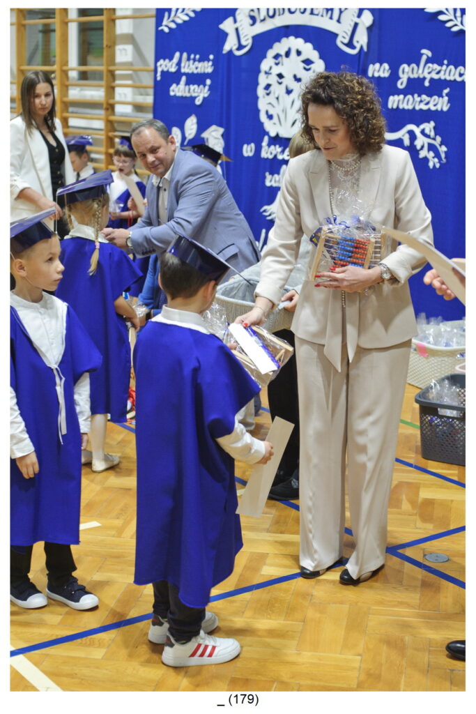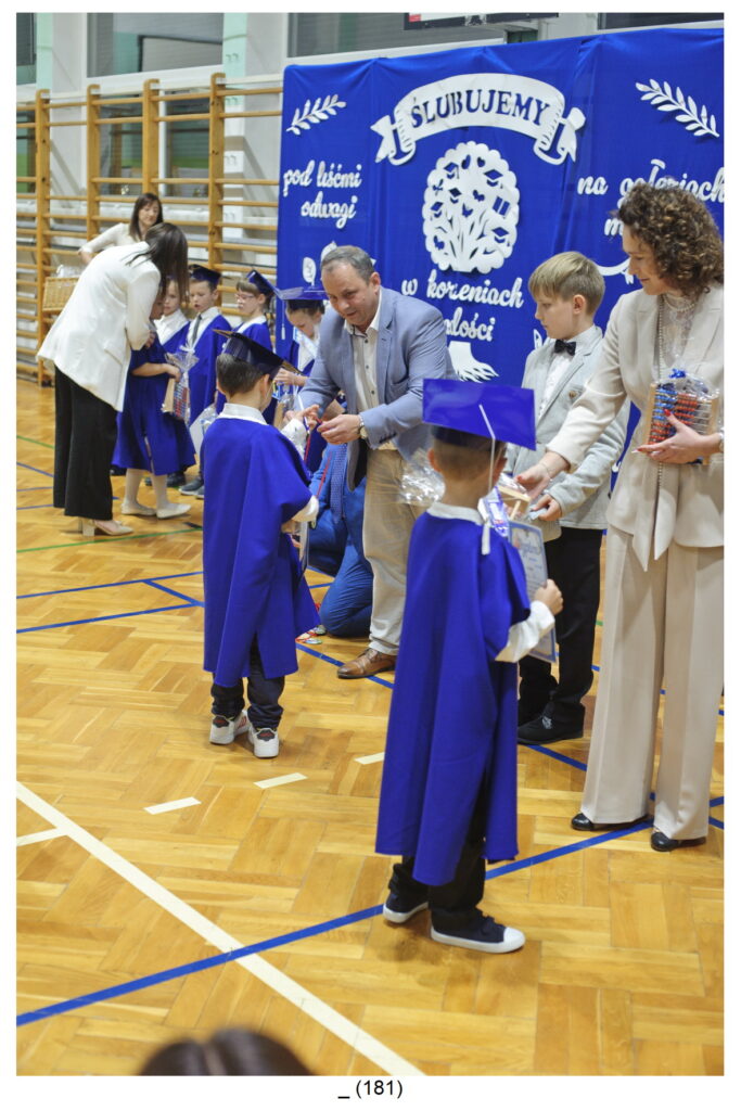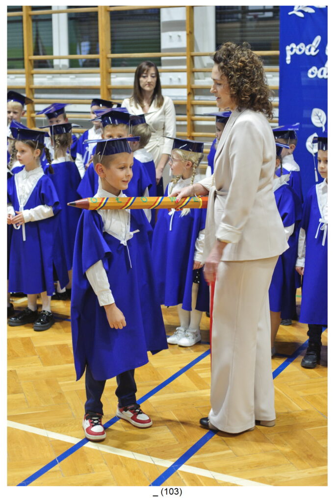 Po części artystycznej nadszedł najbardziej uroczysty moment – ślubowanie pierwszoklasistów na sztandar szkoły. Dzieci złożyły uroczystą przysięgę, obiecując sumiennie się uczyć, szanować nauczycieli, kolegów oraz dbać o dobre imię szkoły. Następnie pani Dyrektor Barbara Skóra-Czachor oraz pan Wicedyrektor Ireneusz Koziarz dokonali aktu pasowania 88 dzieci symbolicznym ołówkiem, wypowiadając słowa: „Pasuję Cię na ucznia”. Każdy pierwszoklasista otrzymał pamiątkowy dyplom oraz drobne upominki na dobry początek szkolnej drogi. Zaproszeni goście również przekazali dzieciom słodycze i medale.