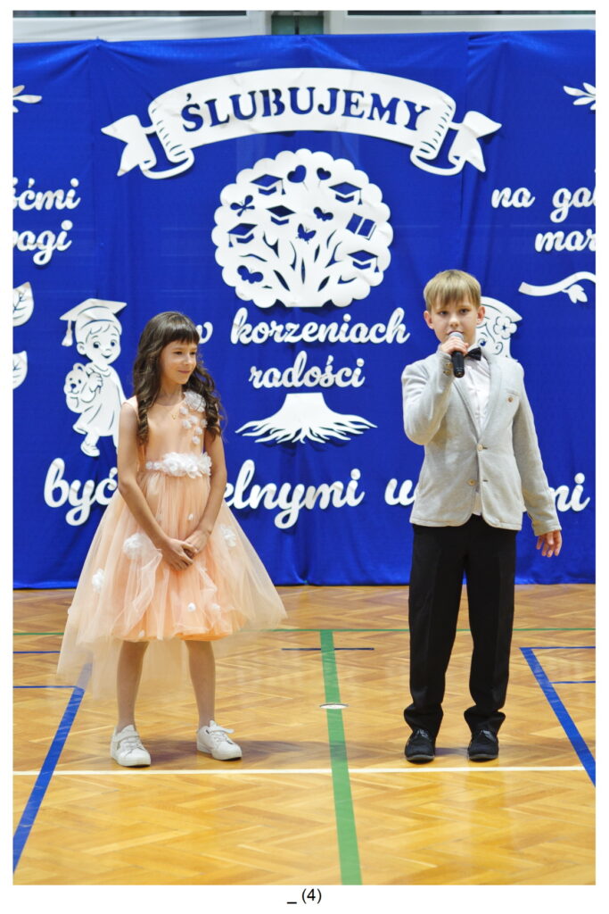 Uroczystość rozpoczęła się od występu artystycznego przygotowanego przez uczniów klas pierwszych pod opieką wychowawców oraz gościnnie z udziałem czwartoklasistów. W myśl przewodnią Jak oni Ślubują pierwszoklasiści przedstawili prawdziwe show! Dzieci zaprezentowały swoje umiejętności wokalne, czym zaskarbiły sobie serca zebranej publiczności – rodziców, nauczycieli oraz zaproszonych gości. Mimo lekkiej tremy, nasi najmłodsi uczniowie poradzili sobie znakomicie. Występ był dowodem na to, że są gotowi, by rozpocząć swoją szkolną przygodę z uśmiechem, odwagą i zapałem do nauki. Jury oraz rodzice byli zdecydowanie „na tak”, aby pierwszoklasiści zostali przyjęci do grona uczniów szkoły.