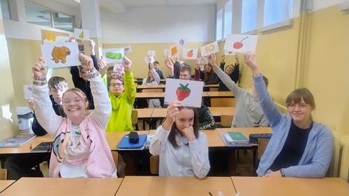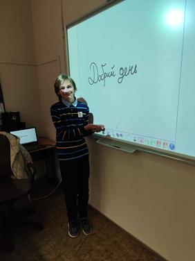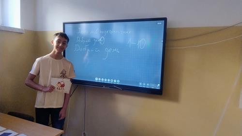 Podczas szkolnych obchodów Dnia Języków Obcych uczniowie naszej szkoły – Trushkovskyi Illia i jego brat Anton – przygotowali i przeprowadzili wyjątkową lekcję języka ukraińskiego dla swoich koleżanek i kolegów. Na zajęciach wszyscy mieli okazję poznać podstawowe słówka: uczniowie nauczyli się liczyć do 10, a także odkryli ukraińskie nazwy kolorów, owoców, zwierząt i przyborów szkolnych. Lekcja była niezwykle ciekawa i pełna radości – uczniowie aktywnie włączali się w naukę, a atmosfera sprzyjała wspólnej zabawie. Najwięcej trudności sprawiło wszystkim słowo „truskawka”, które po ukraińsku brzmi „полуниця” (czyt. polunycia). Z kolei największe uśmiechy wywołało słowo „żółw”, czyli po ukraińsku „черепаха” (czyt. czerepacha). Dzięki tej lekcji uczniowie nie tylko nauczyli się nowych wyrazów, ale również mieli okazję doświadczyć, że nauka języka obcego może być świetną zabawą.