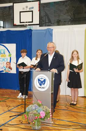 Pierwszego września w naszej szkole odbyła się uroczysta akademia z okazji rozpoczęcia nowego roku szkolnego. Przygotowali ją uczniowie klas 5c i 5d dla swoich młodszych koleżanek i kolegów z klas pierwszych i czwartych. O oprawę muzyczną zadbała pani Beata Głowala, a o stronę literacką- panie Agnieszka Dudzik i Anna Tęcza- Blicharz. Swoją obecnością na tej uroczystości zaszczycił nas włodarz naszej gminy- pan burmistrz Andrzej Kraska oraz ksiądz proboszcz Marek Chorzępa.