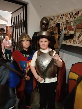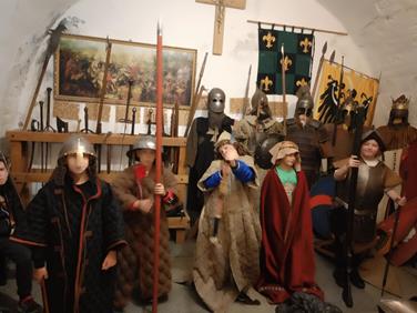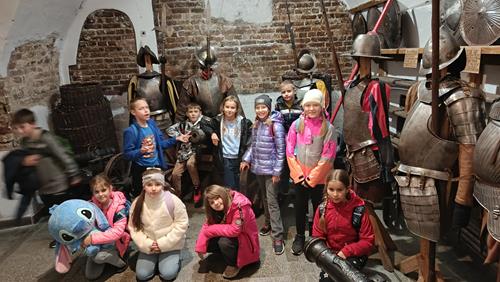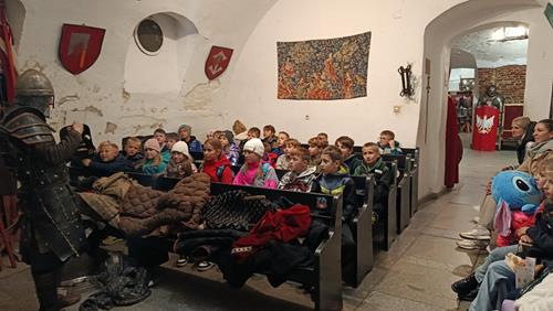 Pierwszym przystankiem była Zbrojownia Rycerska, w której średniowieczni rycerze opowiedzieli uczniom fascynujące sandomierskie legendy. Nie zabrakło także zajęć praktycznych – chłopcy mieli okazję przymierzyć rycerskie zbroje i poczuć ciężar miecza, kuszy czy halabardy, natomiast dziewczęta mogły wcielić się w role renesansowych